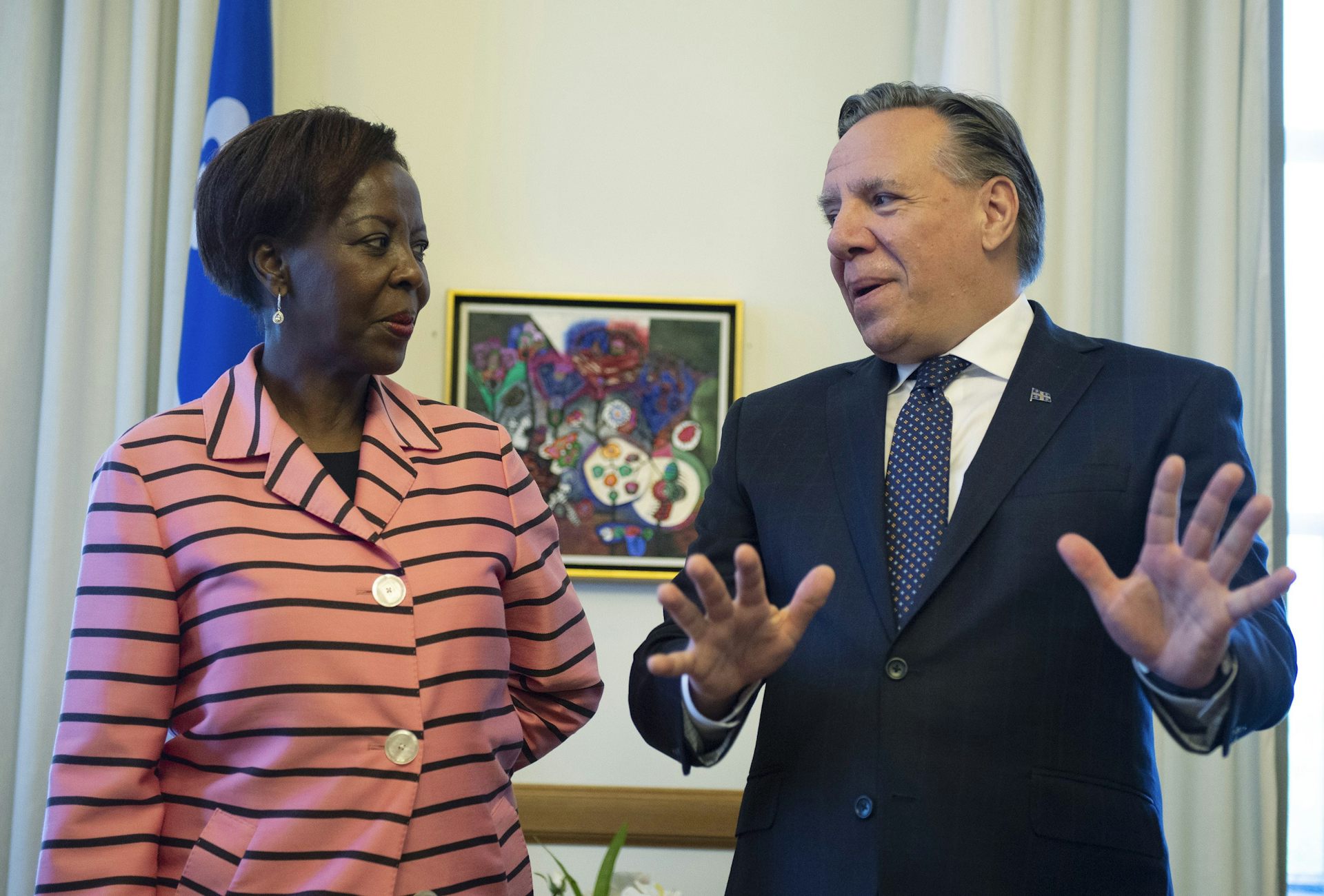 Quebec Premier Francois Legault, right, chats with Louise Mushikiwabo, secretaire generale de la Francophonie, Tuesday, June 11, 2019 in Quebec City.