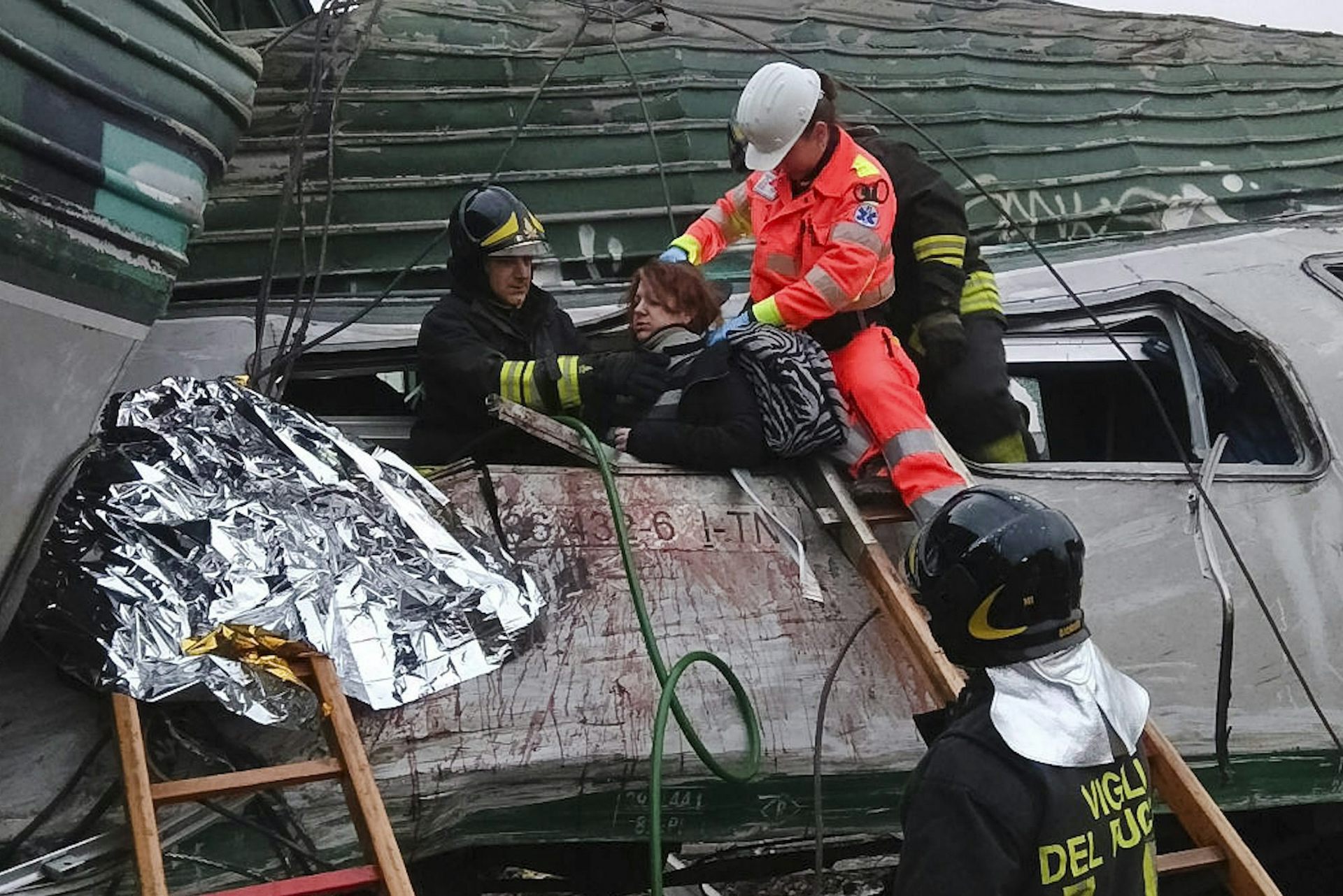A woman is helped out of the wrecked car of a train that derailed at the station of Pioltello Limito, on the outskirts of Milan, Italy, Thursday, Jan. 25, 2018.