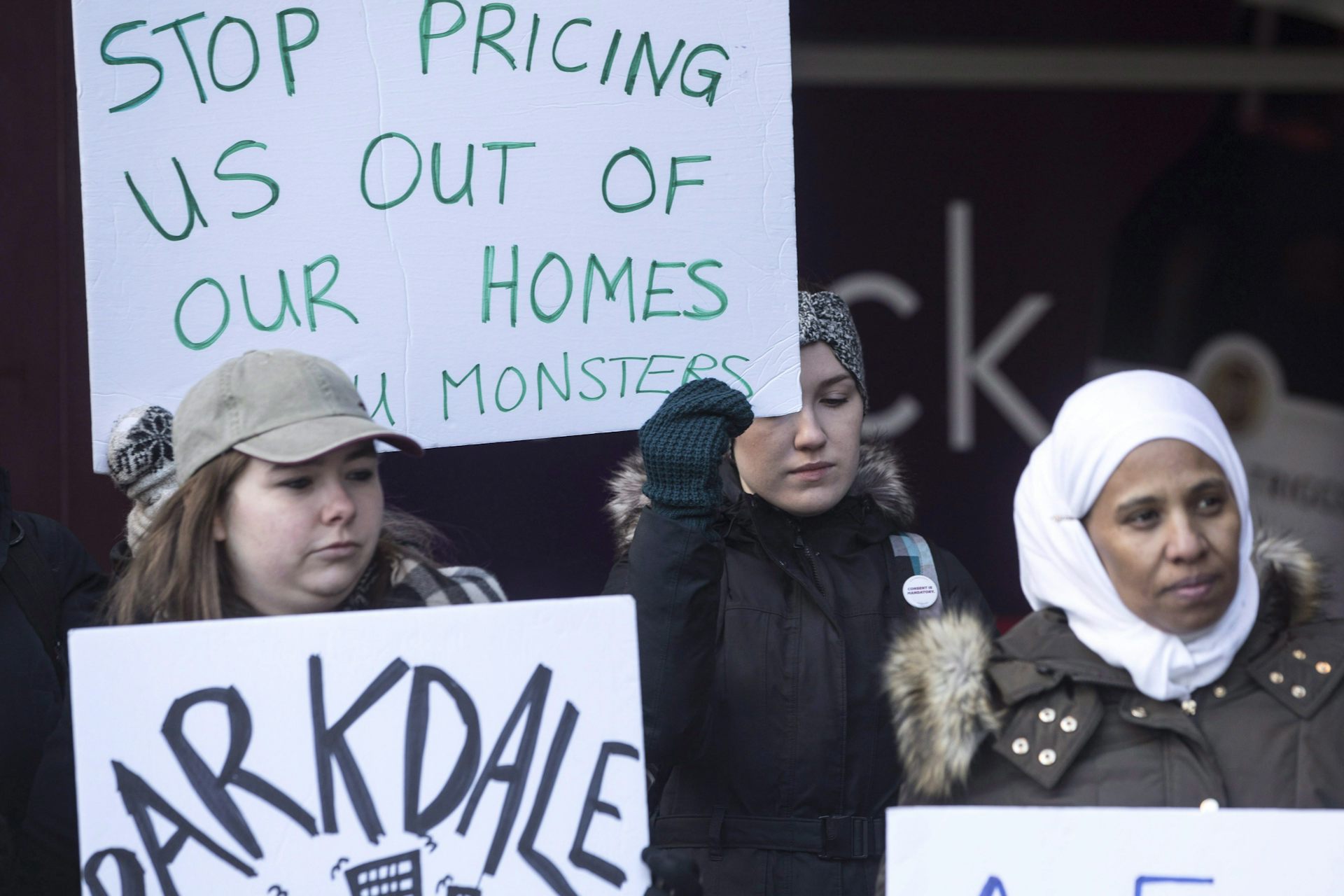 Rent strikers from Toronto’s Parkdale neighbourhood and fellow protesters gather outside Social Justices Tribunal Ontario in February, 2018. The group refused to pay rent after the landlord applied for an increase in rents.