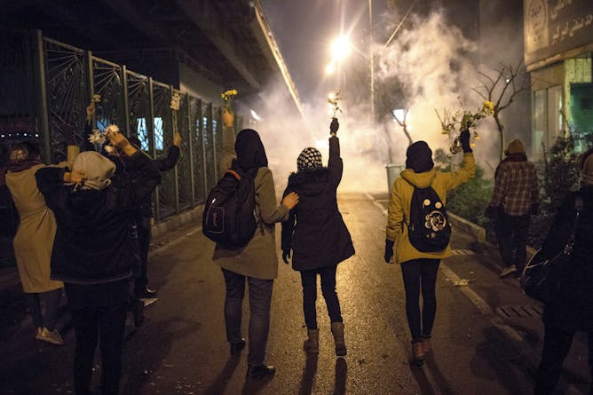 Des manifestants tiennent des fleurs lors de protestations survenues le 11 janvier à l'Université Amir Kabir à Téhéran, en hommage aux victimes de l'écrasement du vol PS752. La police réplique avec des gaz lacrymogène. L'apparente unanimité qui a suivi l’assassinat de Soleimani s’est vite effondrée face à la présence de revendications populaires et d’un mécontentement général.