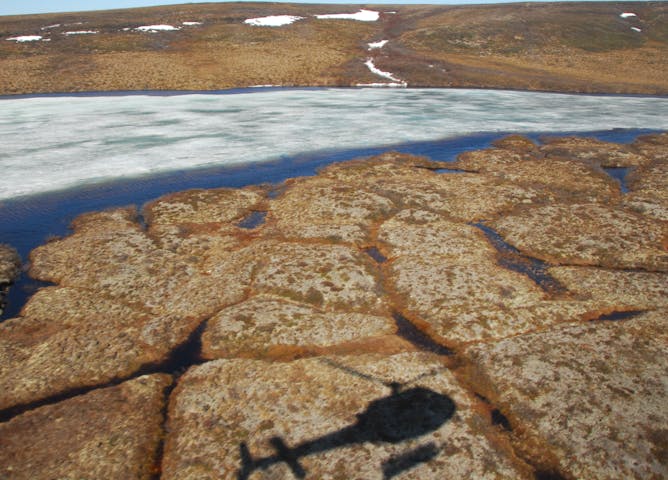 This lake north of Inuvik, N.W.T., is expanding as the ice wedges (darker lines leading away from the lake) around this lake melt and the ground subsides.