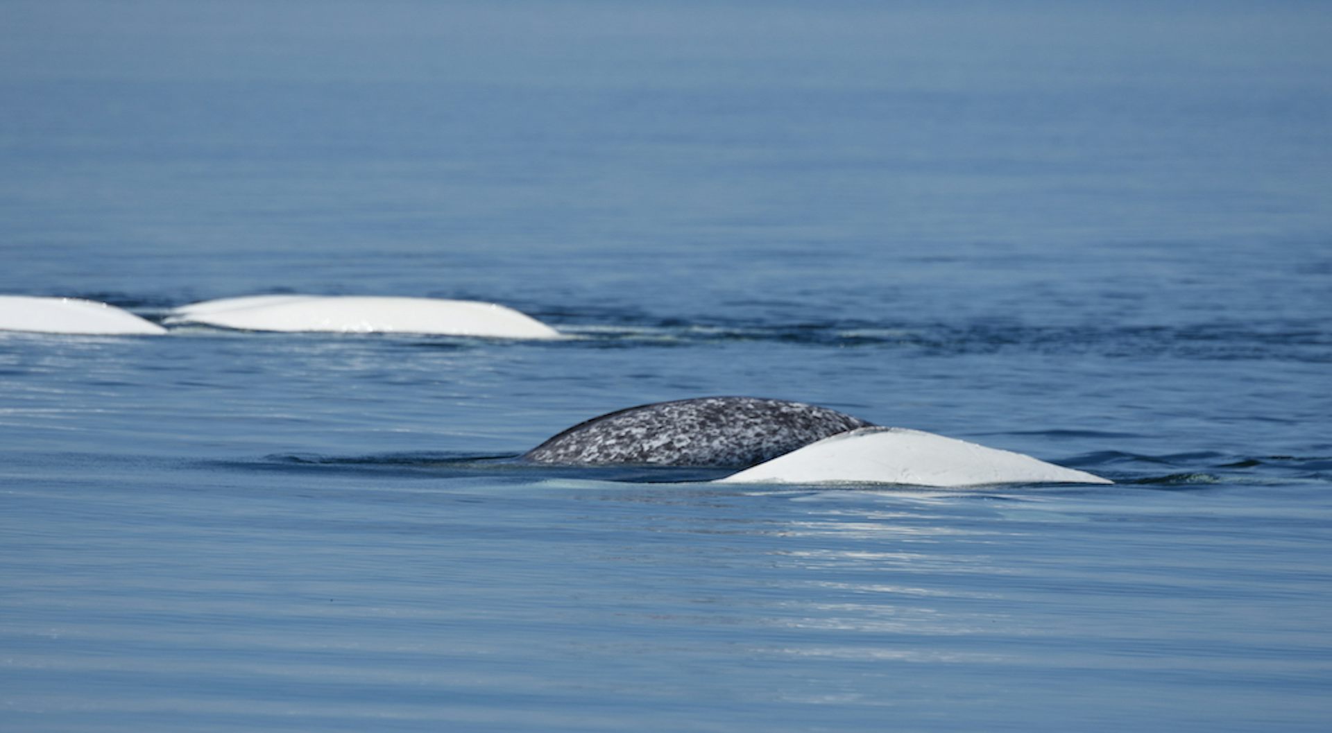 A narwhal is spotted swimming with a group of belugas in the St. Lawrence.