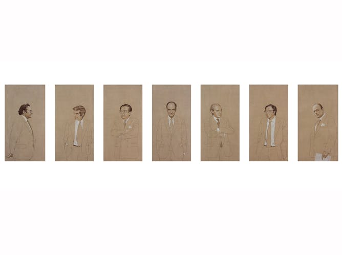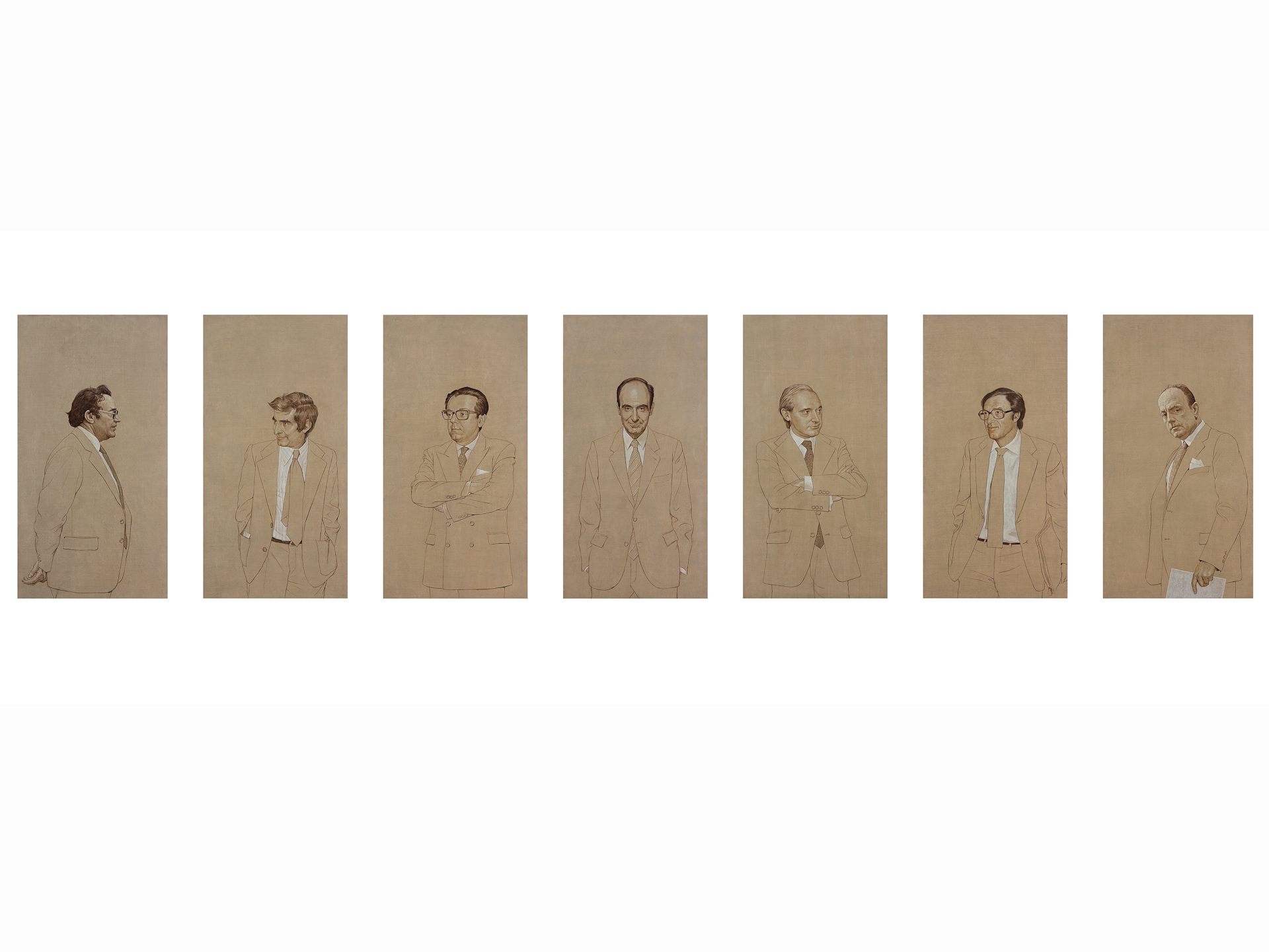 Retratos de los ponentes de la Constitución Española obra de Hernán Cortés Moreno. De izquierda a derecha, Gregorio Peces Barba, Gabriel Cisneros Laborda, Miguel Herrero y Rodríguez de Miñón, Miquel Roca Junyent, José Pedro Pérez Llorca, Jordi Solé Tura y Manuel Fraga Iribarne.