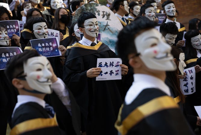 Students wear Guy Fawkes masks during a protest on November 5 in Hong Kong.