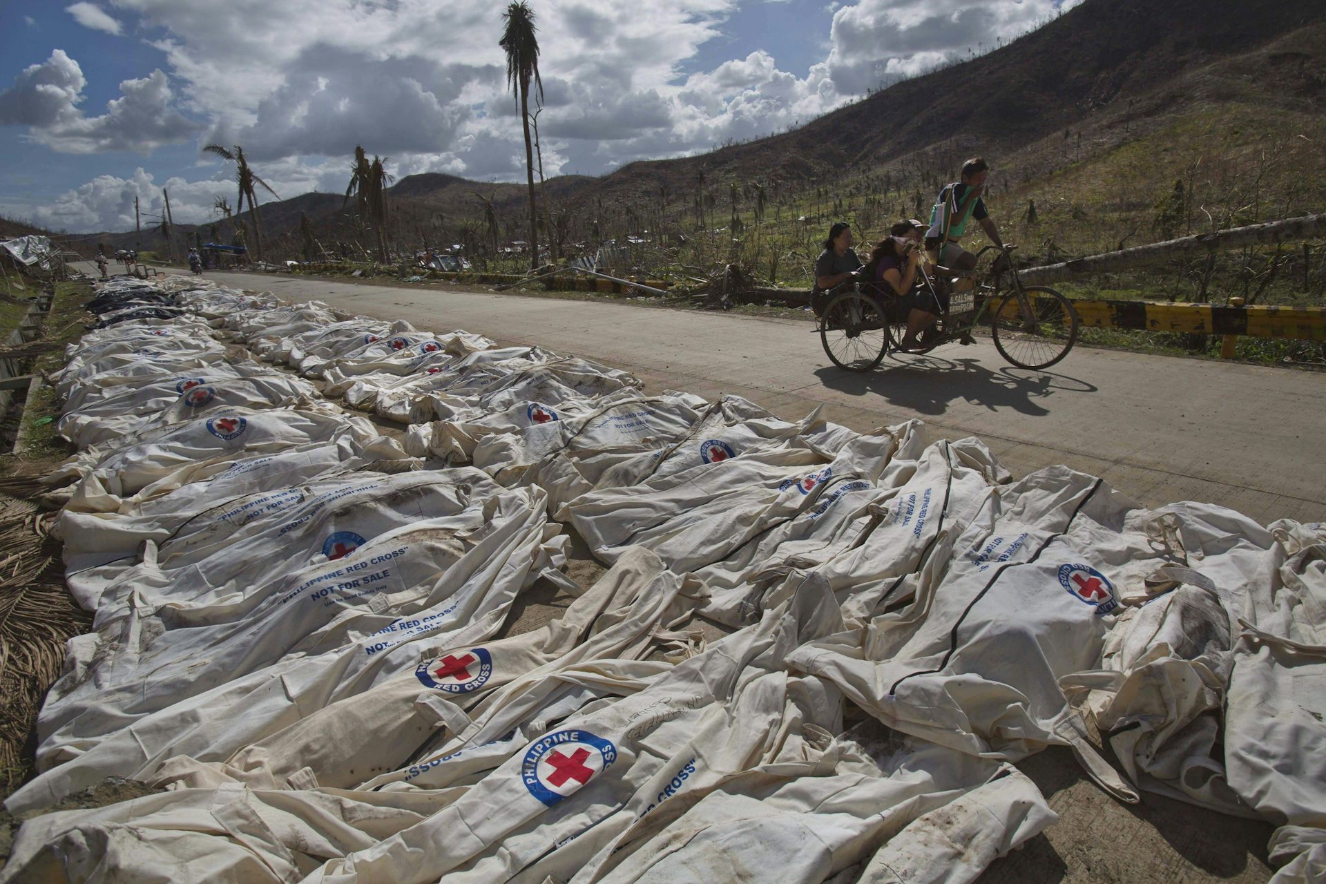 In this November 2013, photo, Typhoon Haiyan survivors pass by hundreds of victims in body bags near Tacloban, Philippines. Haiyan left more than 7,300 people dead or missing.