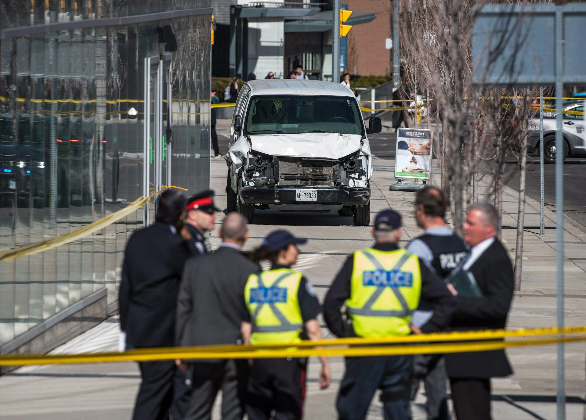 Toronto police talk to a woman after a van mounted a sidewalk crashing into a number of pedestrians in Toronto, killing 10 people.