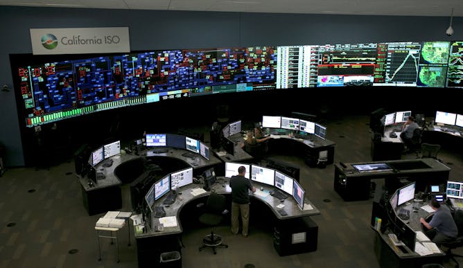 Monitoring the flow of electrical power at the California Independent System Operator grid control center.