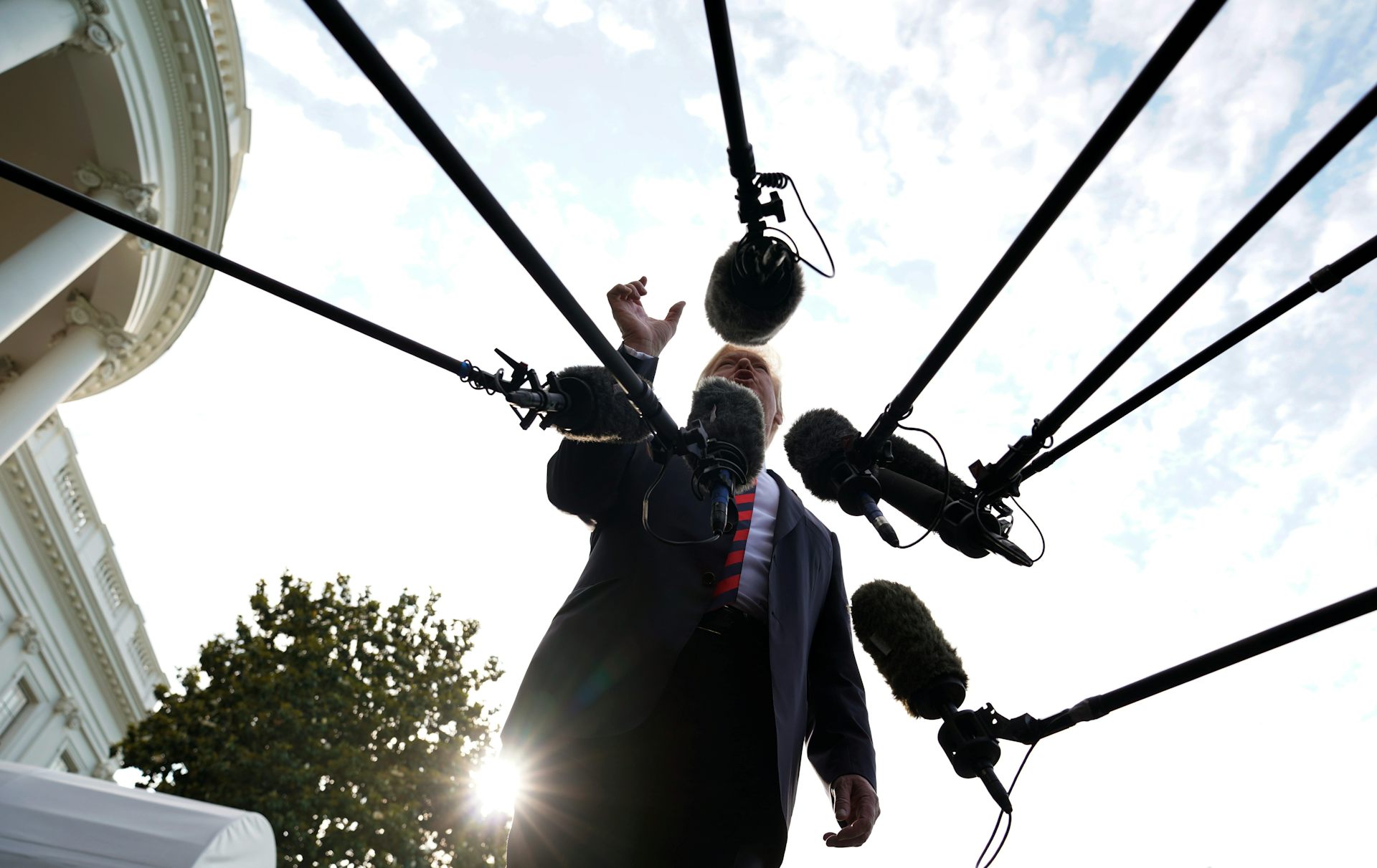 Trump answers questions before departing the White House on his way to the G7 in Quebec.
