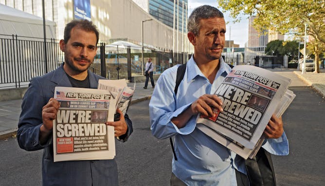 The Yes Men in 2009 handing out spoof editions of the ‘New York Post’ with the lead story ‘We’re Screwed’ outlining how “climate change is threatening the lives of New Yorkers — especially those who take the subway to work.