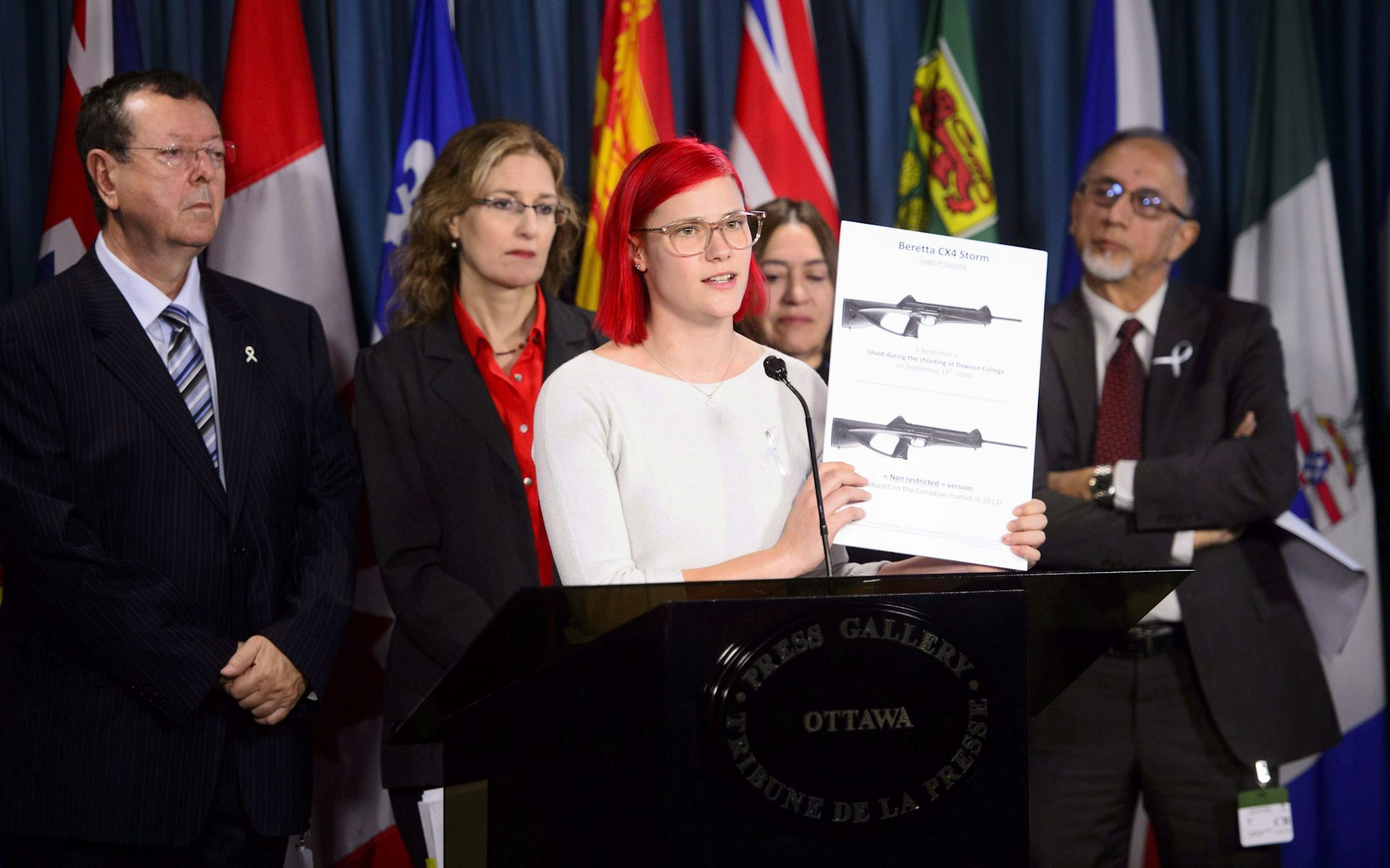 Meaghan Hennegan, who was shot twice during the Dawson College shooting in 2006 in Montreal holds up a board showing assault weapons as she joins other gun control advocates at a news conference on Bill C-71 on Parliament Hill in Ottawa in December 2018. THE CANADIAN PRESS/Sean Kilpatrick.