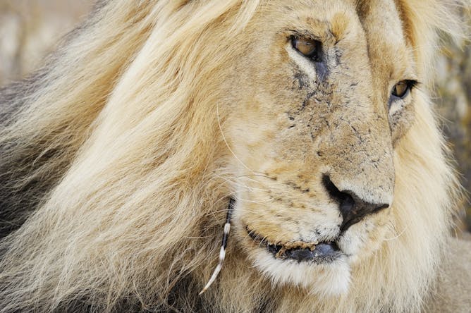 A male lion with a porcupine quill lodged in his cheek.