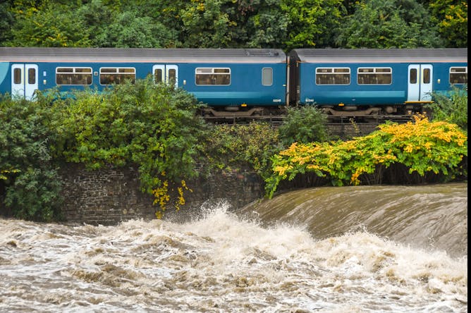 A commuter train passes the swollen River Taff, near Cardiff.