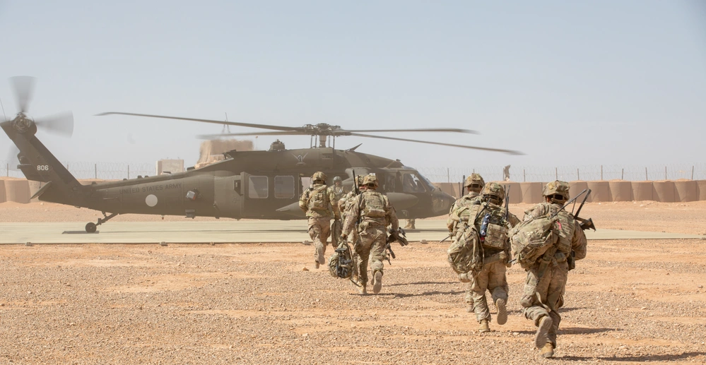 U.S. Army Soldiers assigned to the 10th Mountain Division, Task Force Armadillo, load into a UH-60 Black Hawk helicopter during air assault training, Al-Tanf Garrison, Syria, Feb 25, 2025. (U.S. Army / Staff Sgt. Fred Brown)