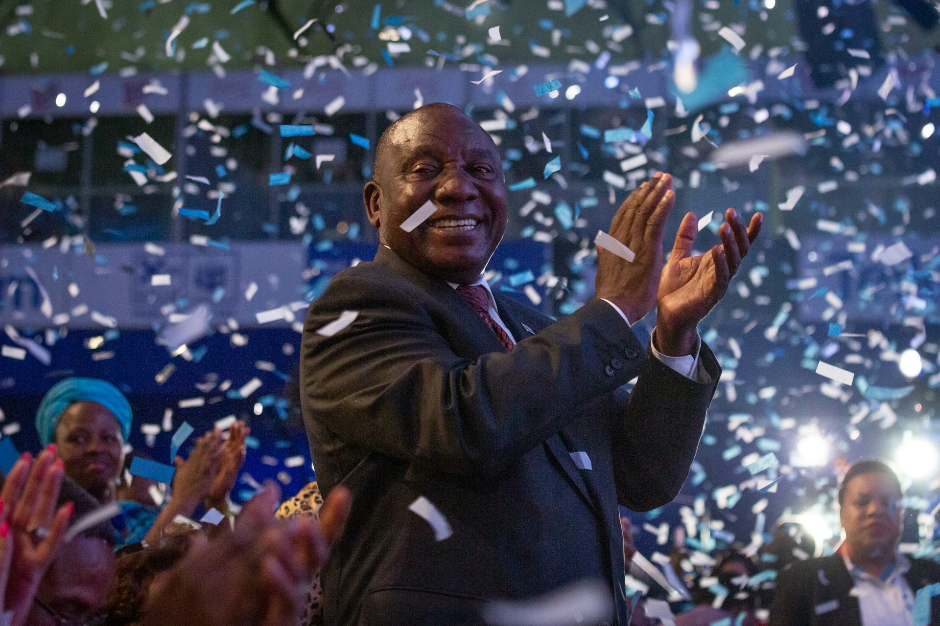 South African President Cyril Ramaphosa cheers during the results announcement ceremony in Pretoria, South Africa.