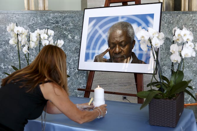 A United Nations staff member pays tribute to Kofi Annan during a ceremony at the European headquarters of the UN in Geneva, Switzerland.