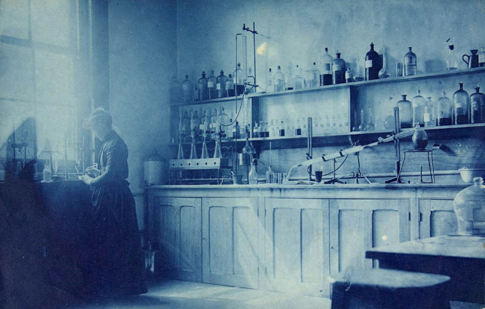 A woman measures a substance into a set of small scales in a laboratory, Toronto, Ontario (1892)