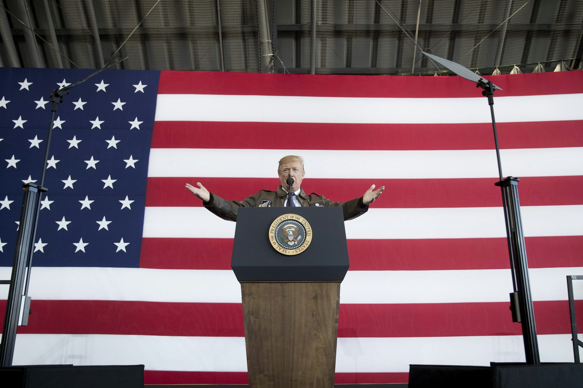 U.S. President Donald Trump speaks at a hangar rally in Japan on Sunday. With the first anniversary of his election coming this week, Trump is on a five-country trip through Asia travelling to Japan, South Korea, China, Vietnam and the Philippines.