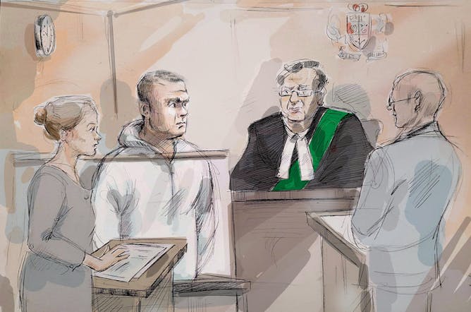 Alek Minassian (second from left in this courtroom sketch) is accused of driving a van into pedestrians along a stretch of a busy Toronto street on Monday April 23, 2018.