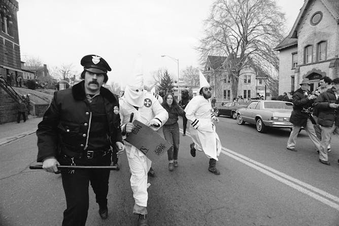 Connecticut members of the Ku Klux Klan, escorted by Meriden, Conn. police, run for shelter as protesters pelt them in March 1981.