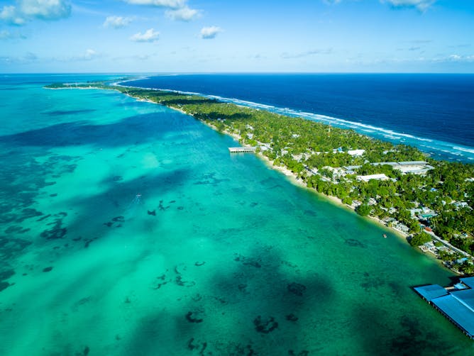 Un atoll de la République de Kiribati, une nation insulaire du Pacifique Sud en danger de disparition en raison des changements climatiques.