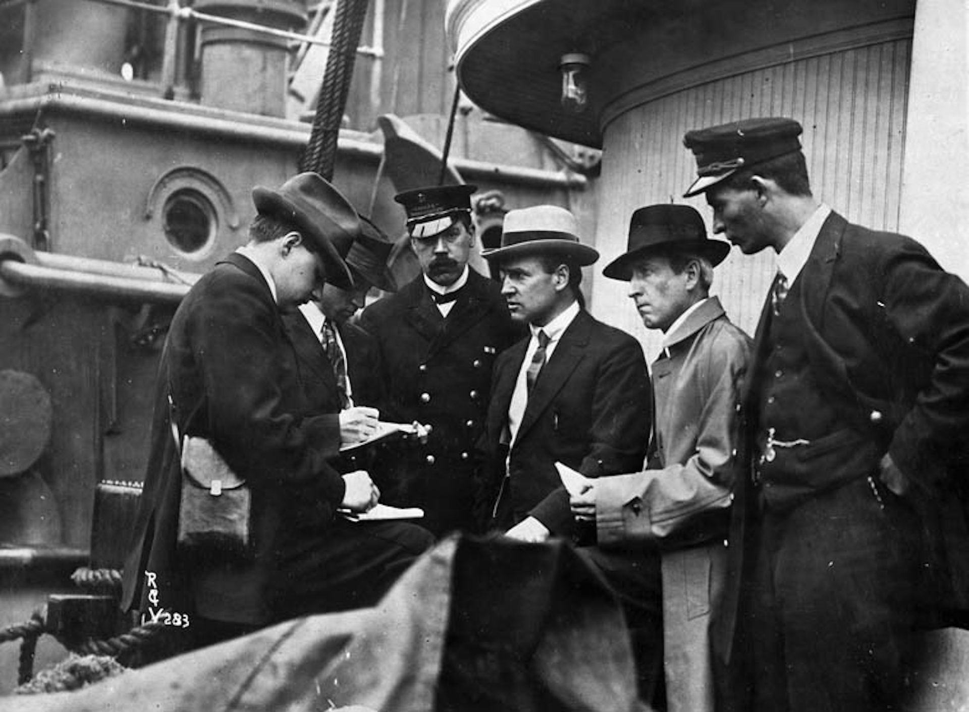 A new mural depicts Indigenous paddlers taking food to passengers on the legendary ship Komagata Maru that was denied entry to Vancouver in 1914. Federal official Harry Stevens, with white hat, led the campaign to keep the ship from docking.