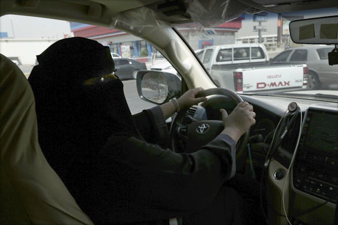 A woman in Saudi Arabia drives to work for the first time in Riyadh.
