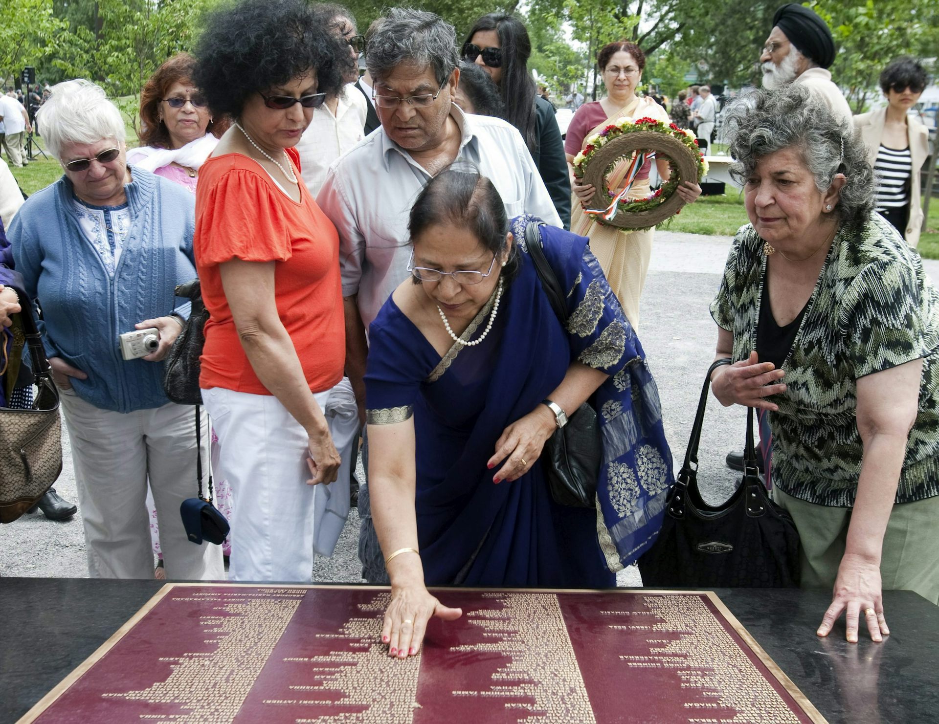 Des amis et des membres de familles de victimes de l'attentat d'Air India cherchent les noms des êtres chers, lors de l'inauguration d'un nouveau monument commémoratif, le 23 juin 2011 à Montréal. L'attentat n'a pas occupé une place importante dans la mémoire collective.