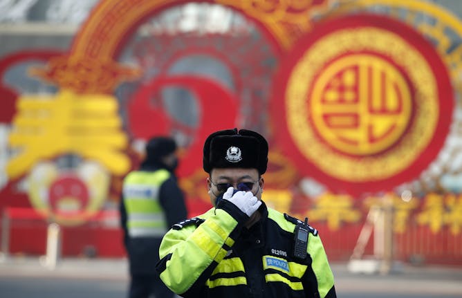 A police officer in Beijing adjusts his face mask, which millions in China are using in hopes of preventing coronavirus infection, on Feb. 9, 2020. The virus is causing major disruptions.