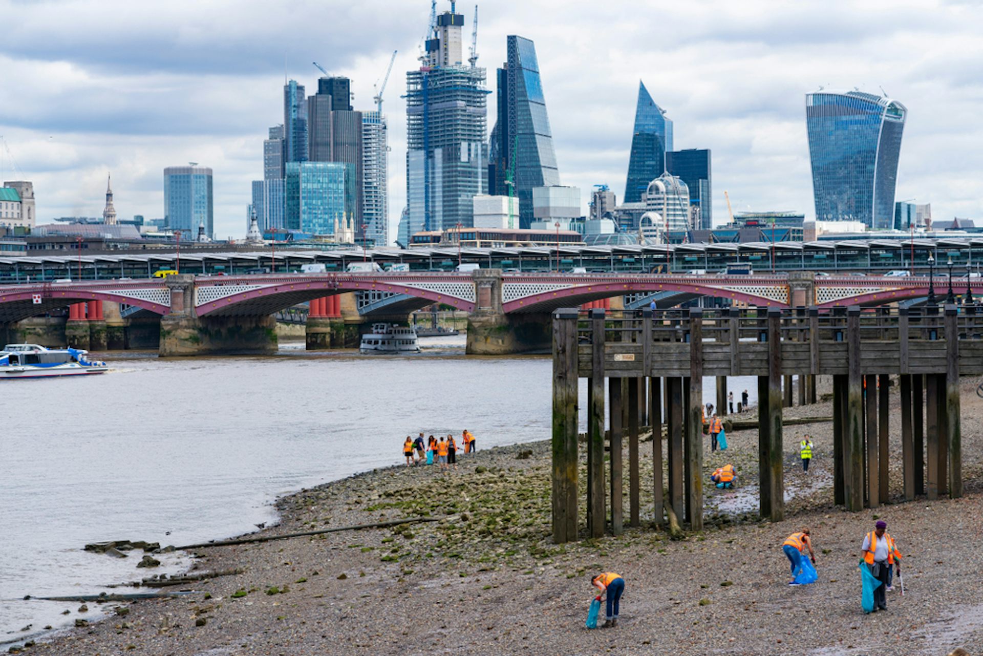 London - June 19 2018: Volunteers cleaning the southern shores of the Thames from waste during low tide.