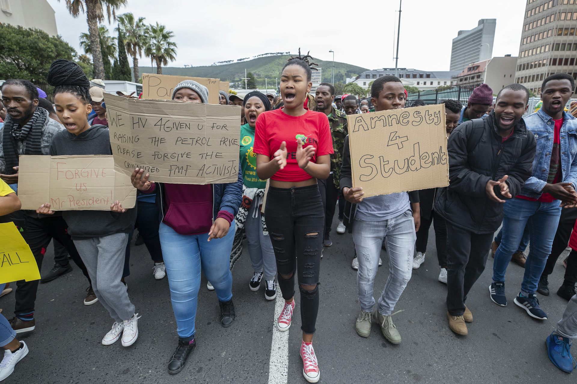 South African students protest outside Parliament in support of students convicted over the #FeesMustFall protests.