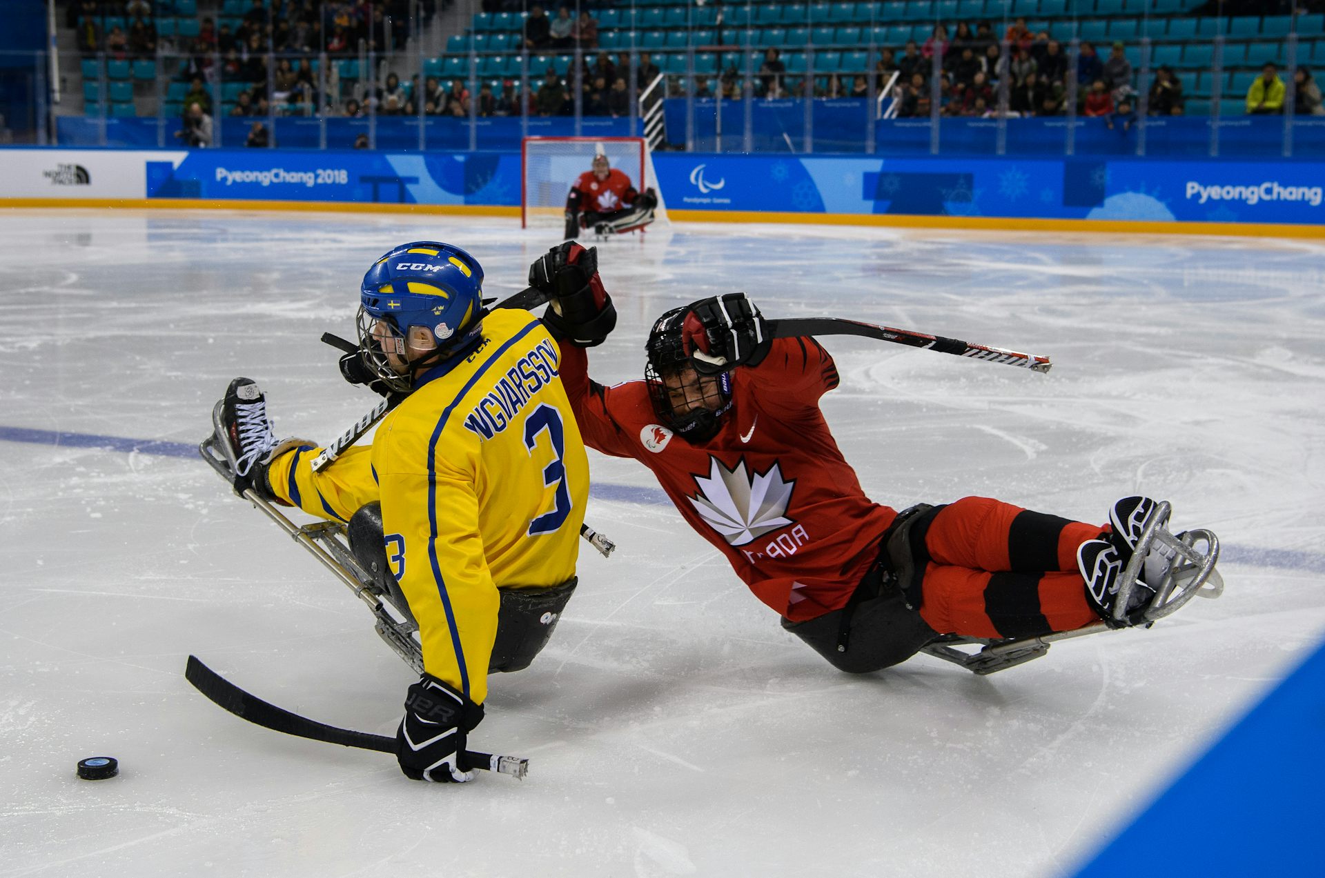 Niklas Ingvarsson of Sweden and Steve Arsenault of Canada in action during the Paralympic Winter Games in Pyeongchang, South Korea.