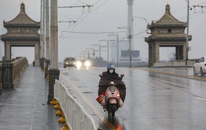 A motorcyclist rides across a bridge in Wuhan, China, in January 2020. The city as banned most vehicle use downtown in an effort to contain the spread of the novel coronavirus.