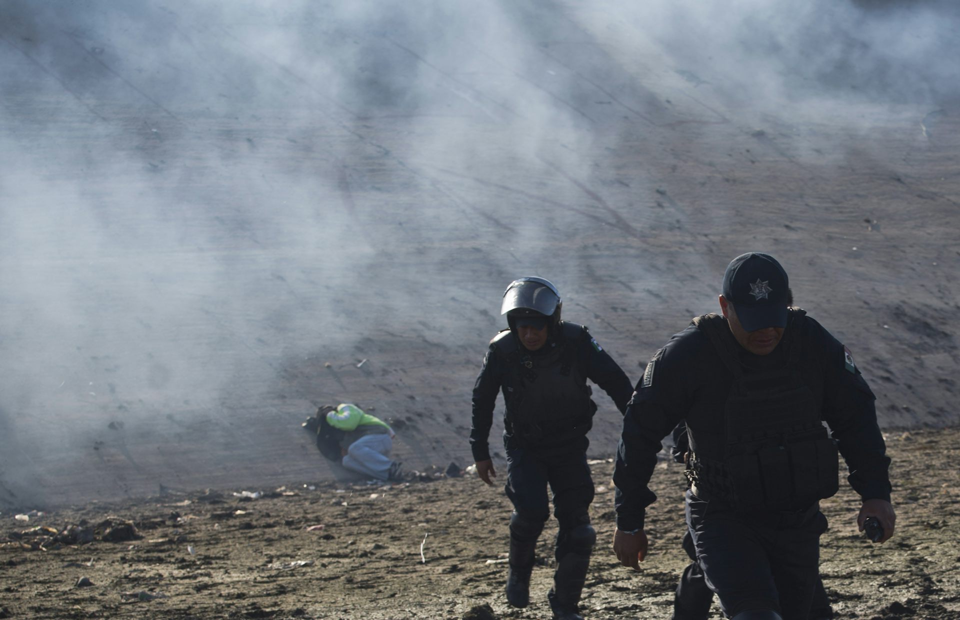 A Honduran migrant lies on a riverbank as Mexican police move away from tear gas fired by U.S. agents at the Mexico-U.S. border in Tijuana, Mexico, on Nov. 25, 2018.