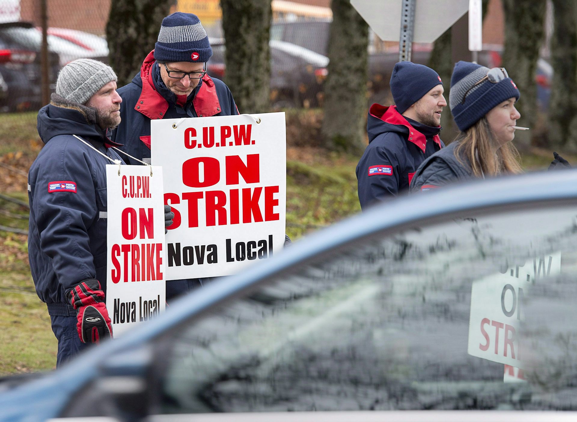 Canada Post workers walk the picket line during a rotating strike in Halifax on Nov. 13, 2018.