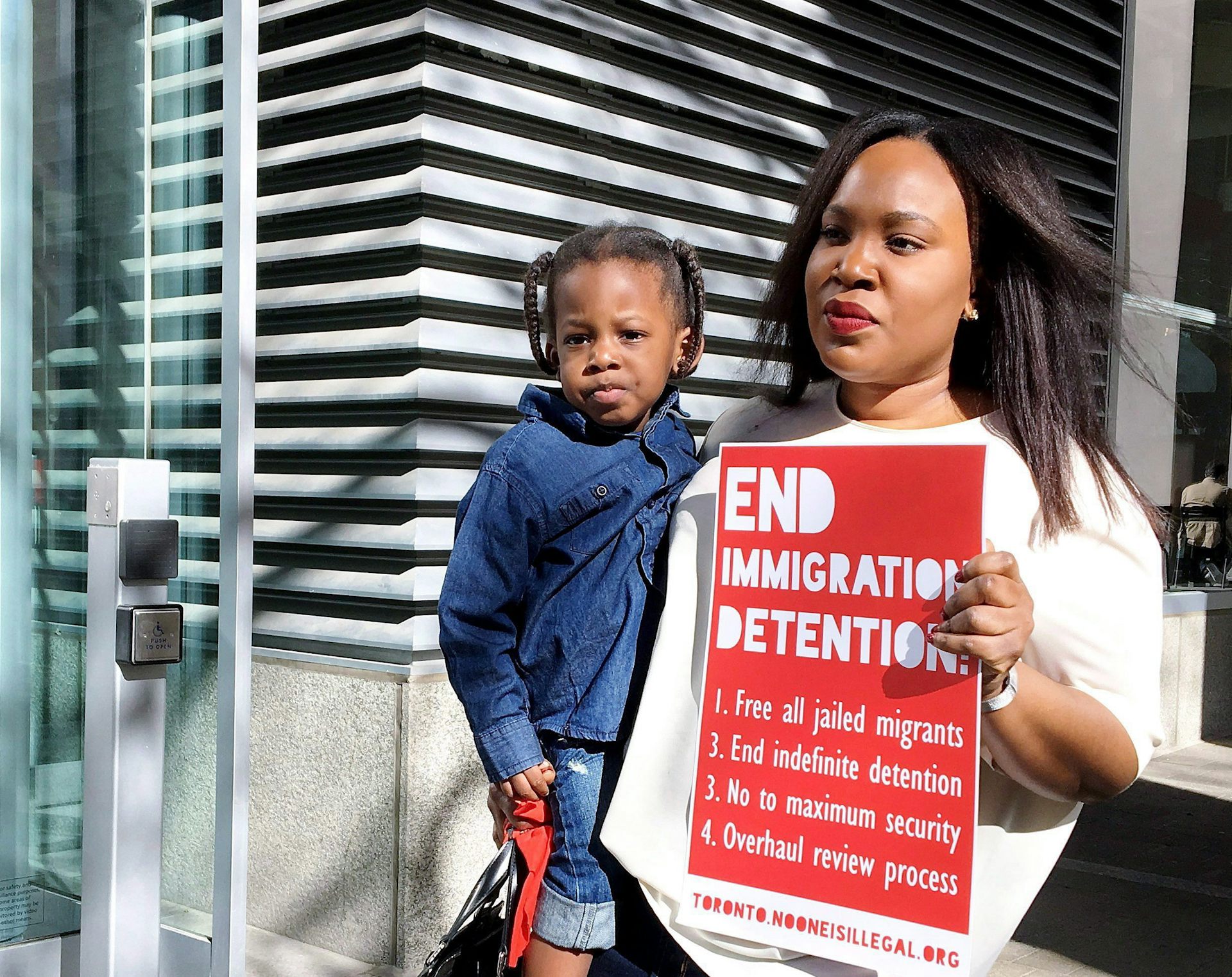 Kimora Adetunji, 33, is seen with her son King, 2, outside Federal Court in Toronto in May 2017, where indefinite immigration detention was subject of a court hearing. Her husband was detained for almost a year before being released.