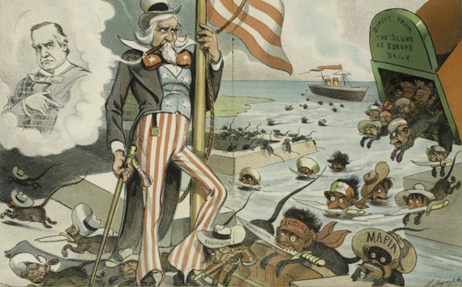 Un dessin datant de 1903 signé Louis Dalrymple dépeint les immigrés européens comme des « rats » (dans le magazine Judge).