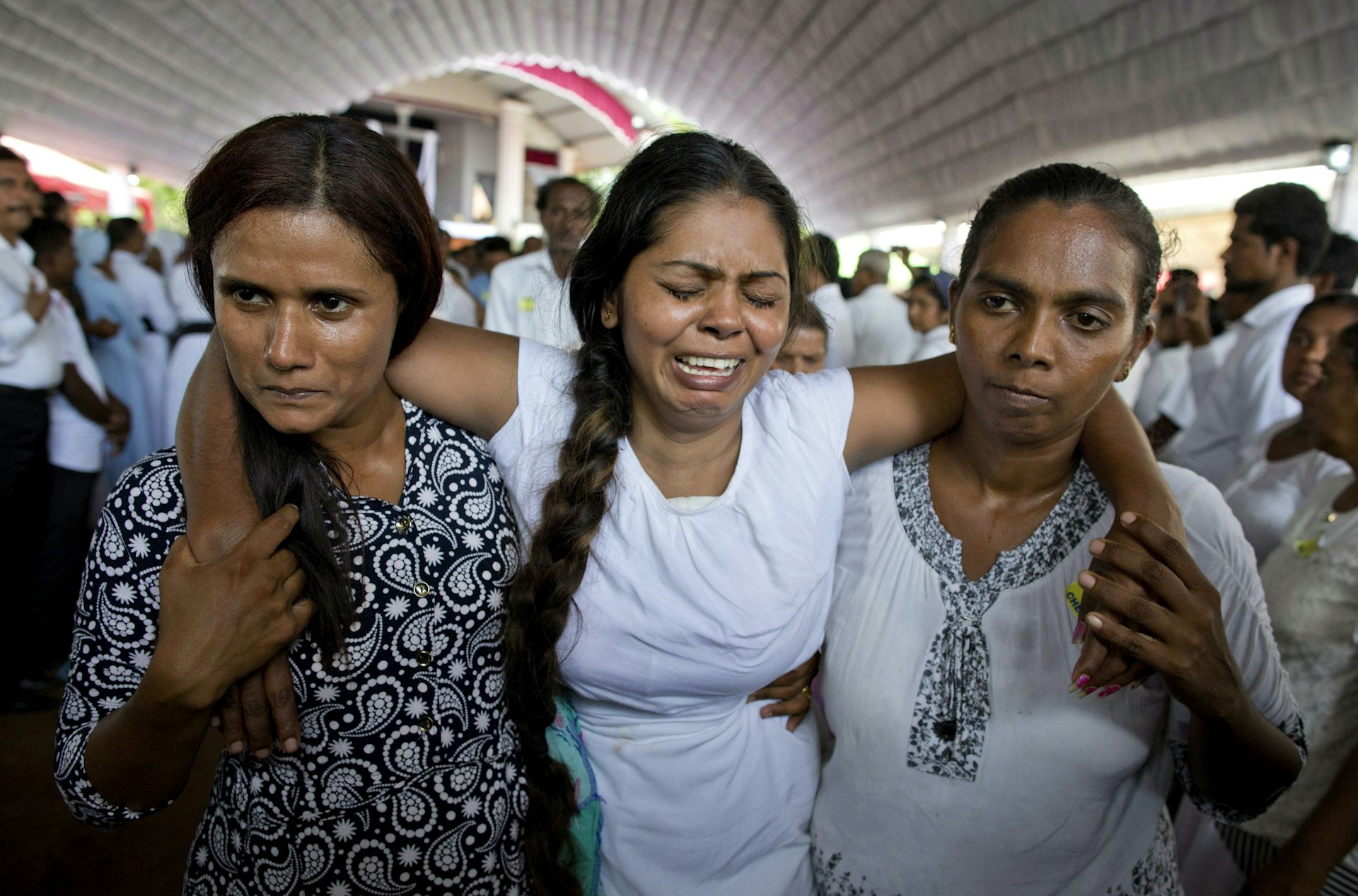 Une femme est soutenue, mardi, lors d'un service funéraire pour les victimes de l'attentat de dimanche contre l'église St. Sebastian à Negombo, au Sri Lanka.