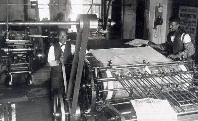An 1899 photograph of the pressroom of the Planet, a newspaper in Richmond, Va.