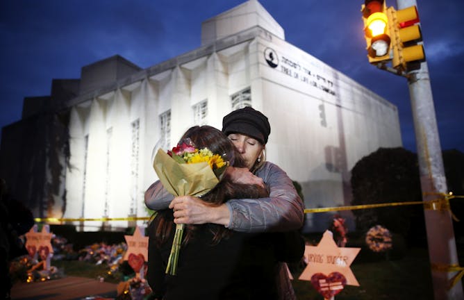 Two women hug before placing flowers at the Star of David memorial in front of the Tree of Life Synagogue, two days after a mass shooting in Pittsburgh, Pennsylvania.