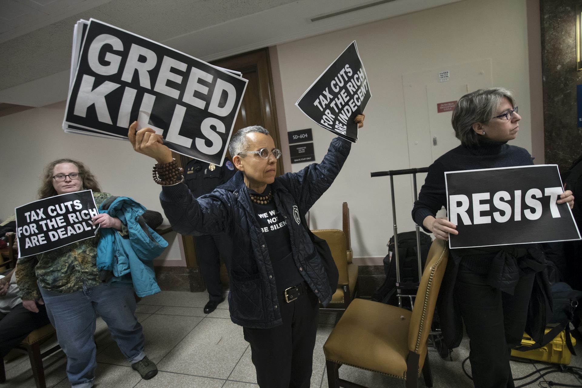 Protesters shout their disapproval of the Republican tax bill on Nov. 28, 2017.