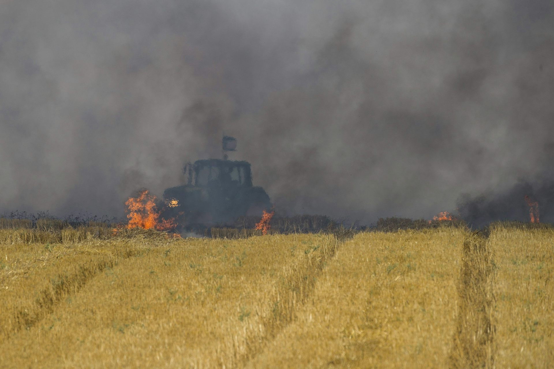 In this June 2018 photo, an Israeli tractor works to extinguish a fire started by a kite with an incendiary device launched from Gaza in a wheat field near the Israel/Gaza border.