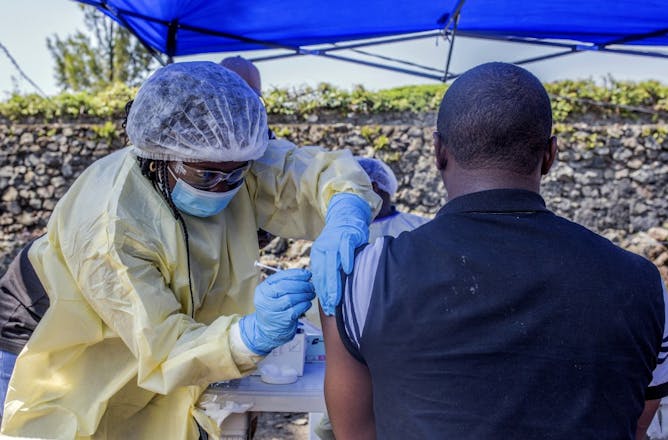 Vaccination devant le Afia Himbi Health Center le 15 juillet  2019 à Goma en RDC. L'épidémie d'Ebola a montré une résurgence d'une politique répressive et autoritaire dans le traitement des patients.