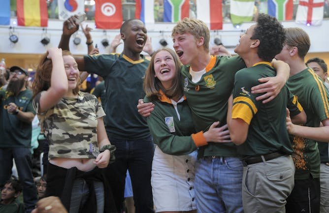 South Africans celebrate the Springboks winning the 2019 Rugby Woirld Cup.