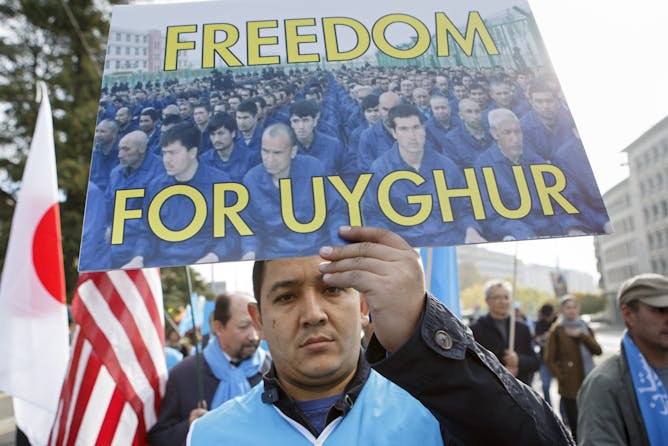 Uyghur people protest outside the UN headquarters in Genevea in November 2018.