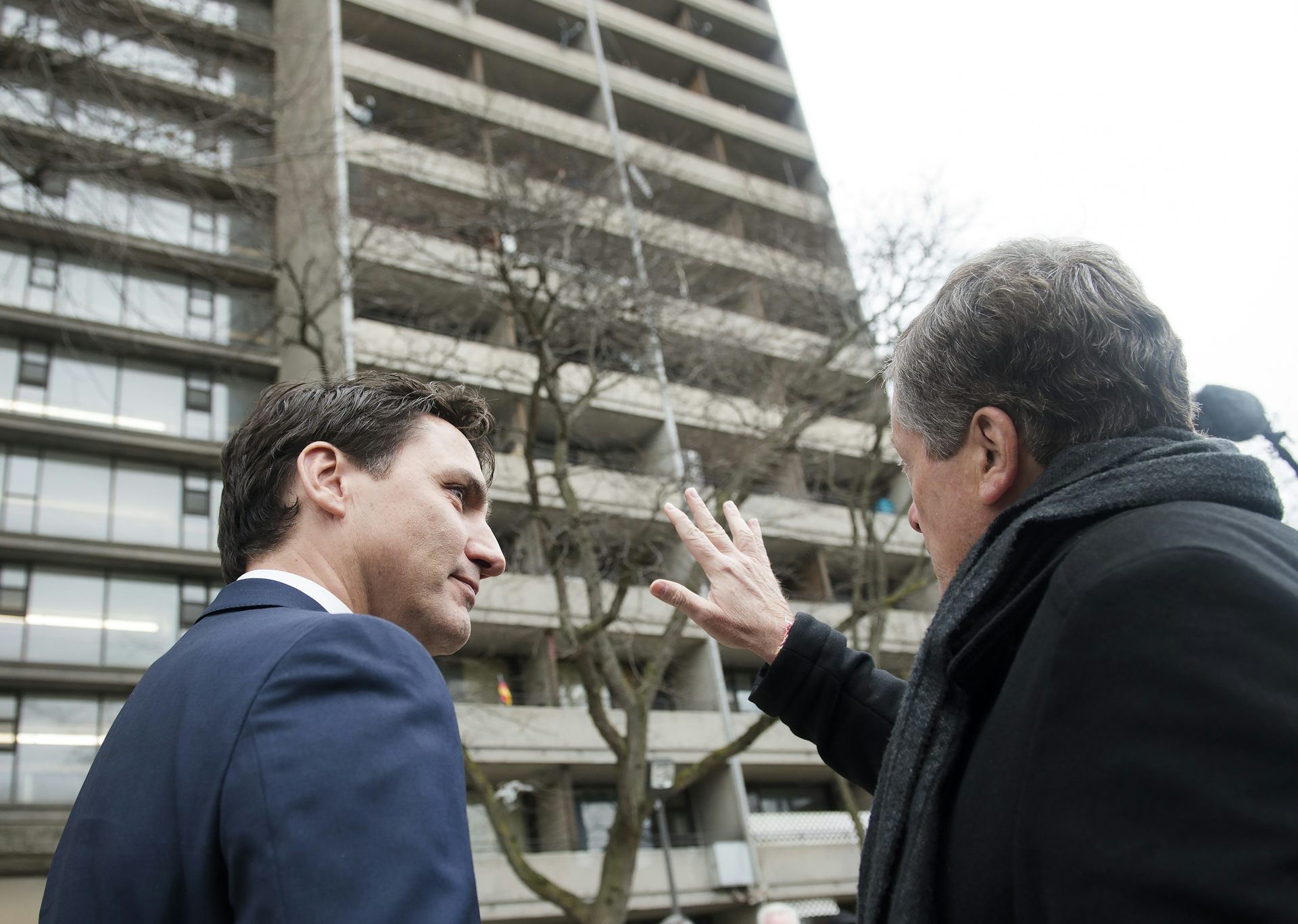 Prime Minister Justin Trudeau, left, speaks with Toronto Mayor John Tory before a recent news conference announcing funding for affordable housing in the Toronto area.