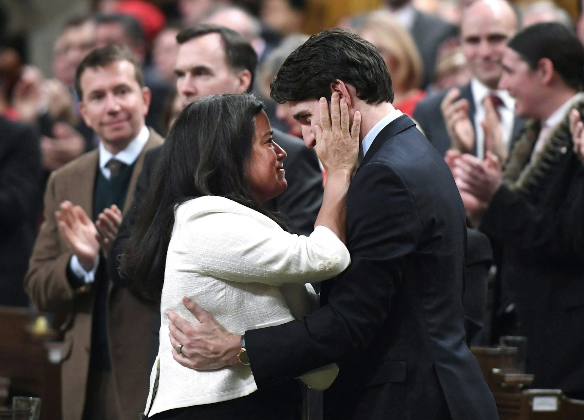 Jody Wilson-Raybould embrasse le premier ministre Justin Trudeau après le discours de ce dernier à la Chambre des communes sur la reconnaissance et la mise en oeuvre des droits autochtones, le 14 février 2018.