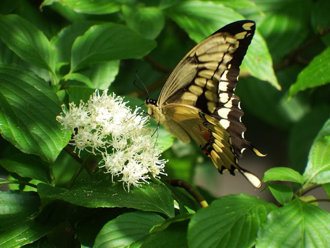 A giant swallowtail butterfly feeds from the flower of an alternate-leaved dogwood.