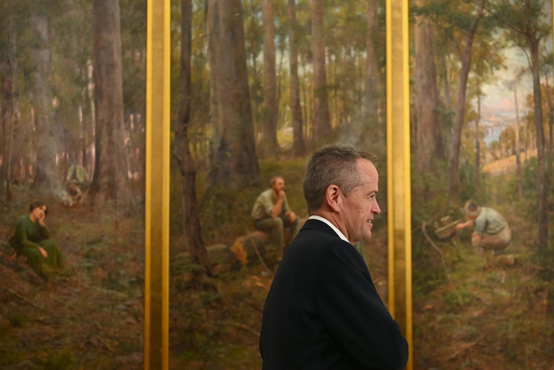 Bill Shorten walks past the painting The Pioneer by Frederick McCubbin at the NGV Australia in Melbourne on May 11.