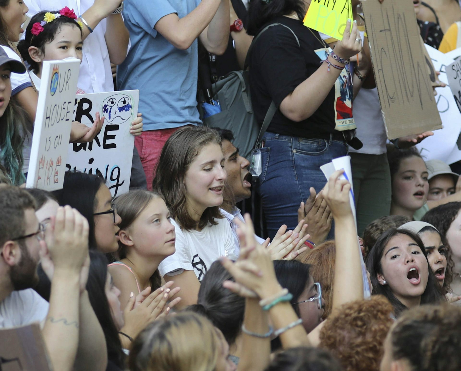 Climate activist Greta Thunberg, centre left, joins a coalition of youth climate leaders and environmental groups during a climate strike outside the United Nations, Aug. 30, 2019, in New York.