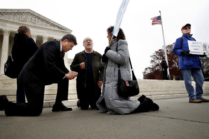 Pastors kneel in prayer in front of the Supreme Court, as a counter-protester holds a sign that says “What’s Christian About Discrimination.”
